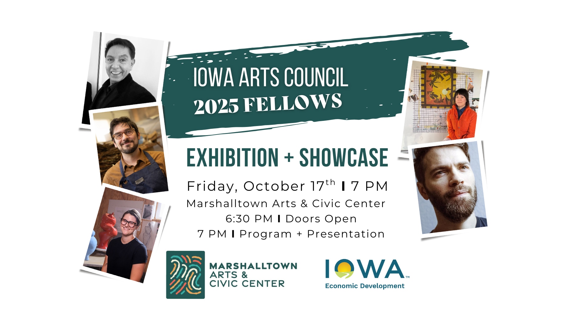 Meet the 2025 Iowa Artist Fellows! Explore their artwork, hear directly from the artists, and celebrate creativity in Iowa. Doors open at 6:30 PM. Program and presentation starts at 7:00 PM.
