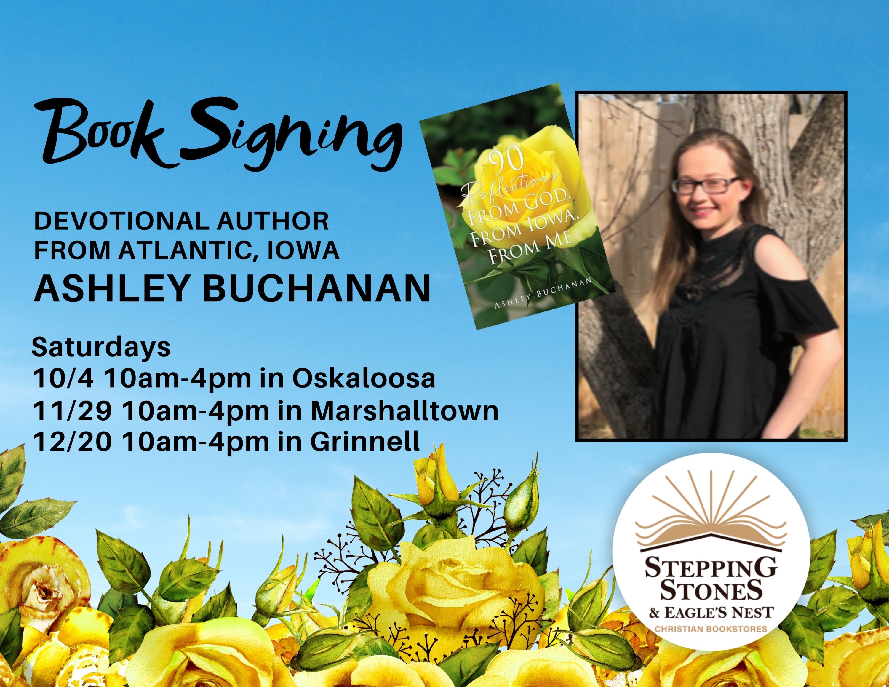 Ashley Buchanan, author of "90 Reflections From God, From Iowa, From Me", will now be visiting Stepping Stones & Eagle's Nest Christian Bookstores 2 more dates.