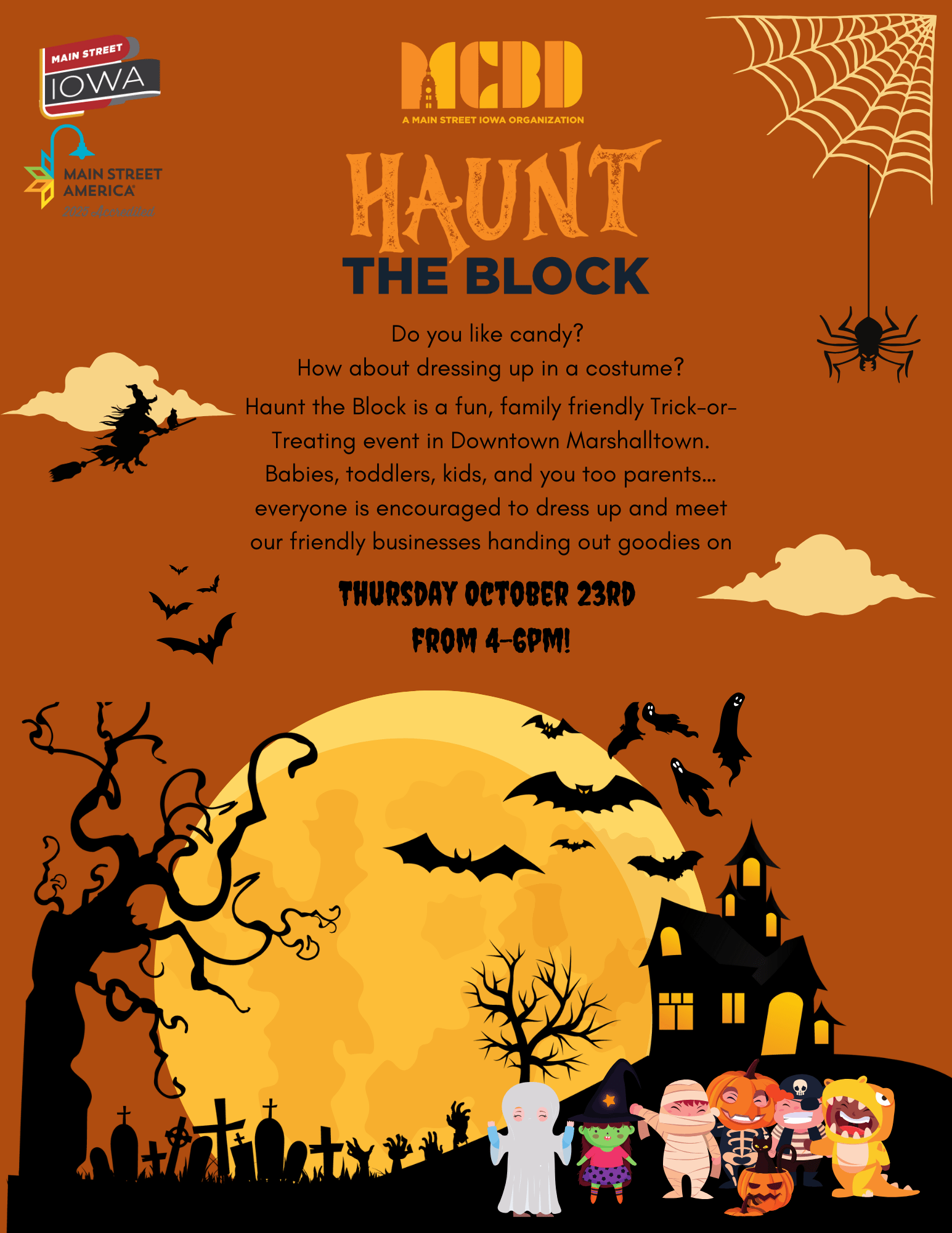 The Marshalltown Central Business District (MCBD) invites families, friends, and neighbors to enjoy a spooktacular evening in downtown Marshalltown during the annual Haunt the Block celebration on Thursday, October 23, 2025, from 4:00 to 6:00 PM.