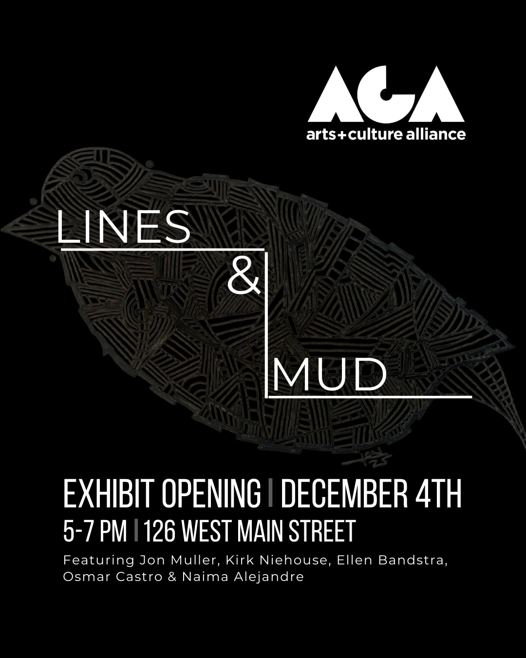Join the Arts + Culture Alliance for the opening reception of Lines & Mud, a new group exhibition featuring the work of talented local artists: Jon Muller • Kirk Niehouse • Ellen Bandstra • Osmar Castro • Naima Alejandre