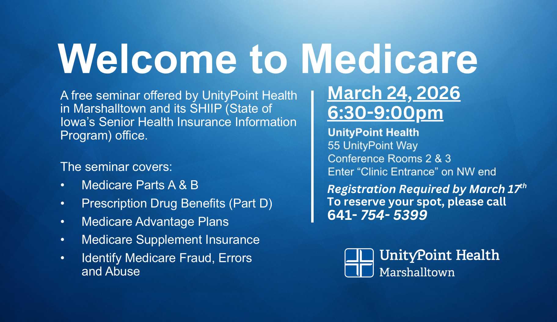 “Welcome to Medicare” is for you! This seminar offered by UnityPoint Health- Marshalltown Hospital and SHIIP counselors, will be held March 24, 2026 from 6:30-8:00pm. “Welcome to Medicare” will cover Medicare Part A and Part B benefits, the prescription drug benefit (Part D), Medicare Advantage plans and Medicare supplement insurance. The seminar will be held at UnityPoint Health- Marshalltown Hospital (55 UnityPoint Way, Conference Rooms 2&3. Enter on the Clinic Entrance on the NW end of the hospital.) Please register by March 17 by calling 641-754-5399.